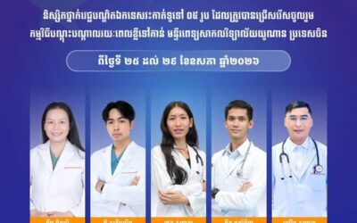 សូមអបអរសាទរ និស្សិតវេជ្ជបណ្ឌិតឯកទេសវះកាត់ ទាំង ៥ រូប បានជ្រើសរើសចូលរួមវគ្គបណ្តុះបណ្តាលរយៈពេលខ្លីស្តីពី International Surgical Training Program ទៅកាន់ មន្ទីរពេទ្យសាកលវិទ្យាល័យ យូណាន (Yunnan University Affiliated Hospital) នៅទីក្រុងគុនមីង ប្រទេសចិន រយៈពេលប្រាំថ្ងៃ
