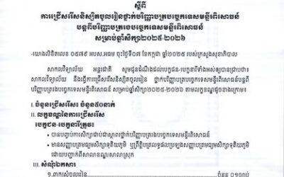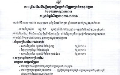 រួសរាន់ធ្វើការចុះឈ្មោះចូលរៀនឥឡូវនេះ ចំនួនមានកំណត់ណា! កាលបរិច្ឆេទ៖ ទទួលពាក្យចាប់ពីថ្ងៃជូនដំណឹងនេះតទៅរហូតដល់ថ្ងៃទី១៨ ខែតុលា ឆ្នាំ២០២៥ ទីតាំង សាកលវិទ្យាល័យ អន្តរជាតិ រាជធានីភ្នំពេញ វិទ្យាស្ថាន បូលីណូ ខេត្តកំពង់ឆ្នាំង សាខាសាកលវិទ្យាល័យ អន្តរជាតិ ខេត្តបាត់ដំបង សម្រាប់ព័ត៍មានលម្អិត៖...