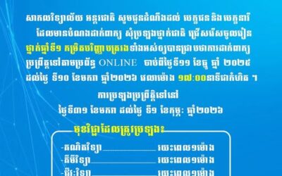 សាកលវិទ្យាល័យ អន្តរជាតិ សូមជូនដំណឹងដល់បេក្ខជន និងបេក្ខនារីទាំងអស់ ដែលមានបំណងដាក់ពាក្យសុំប្រឡងថ្នាក់ជាតិ ដើម្បីចូលរៀនថ្នាក់ឆ្នាំទី១ កម្រិតបរិញ្ញាបត្ររង ឲ្យបានជ្រាបថា៖ • ការដាក់ពាក្យនឹងធ្វើឡើងតាមប្រព័ន្ធ Online ចាប់ពីថ្ងៃទី ១១ ខែធ្នូ ឆ្នាំ២០២៥ ដល់ថ្ងៃទី ១...