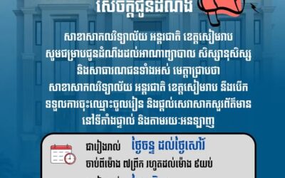 សេចក្ដីជូនដំណឹង សាកលវិទ្យាល័យអន្តរជាតិ សហការជាមួយ Presbyterian Medical Center ប្រទេសកូរ៉េ នឹងរៀបចំសិក្ខាសាលា ពិសេសស្តីពី “បាឋកថាវេជ្ជសាស្ត្រស្តារនីតិសម្បទា ឆ្នាំ ២០២៥” នៅថ្ងៃទី ១៣ ខែកញ្ញា ឆ្នាំ ២០២៥ នៅទីតាំង ...