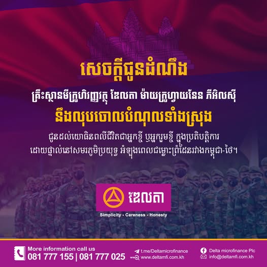 សេចក្តីជូនដំណឹង! គ្រឹះស្ថានមីក្រូហិរញ្ញវត្ថុ ឌែលតា ម៉ាយក្រូហ្វាយនែន ភីអិលស៊ី នឹងលុបចោលបំណុលទាំងស្រុង ជូនដល់យោធិនពលីជីវិតជាអ្នកខ្ចី ឬអ្នករួមខ្ចី ក្នុងប្រតិបត្តិការដោយផ្ទាល់នៅសមរភូមិប្រយុទ្ធ អំឡុងពេលជម្លោះព្រំដែនកម្ពុជា-ថៃ