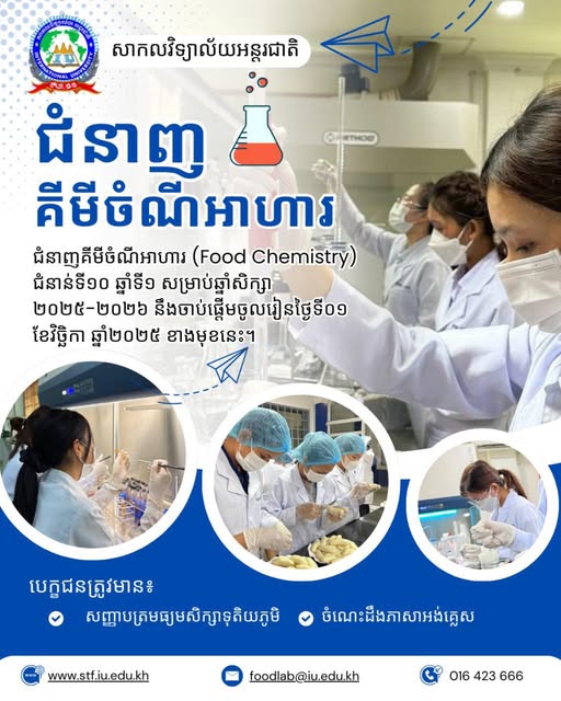 សេចក្ដីជូនដំណឹងស្ដីពីការជ្រើសរើសនិស្សិតចូលសិក្សាថ្នាក់បរិញ្ញាបត្រ ជំនាញគីមីចំណីអាហារ (Food Chemistry) ឆ្នាំទី១ជំនាន់ទី១០ នៅសាកលវិទ្យាល័យអន្តរជាតិ ឆ្នាំសិក្សា ២០២៥-២០២៦