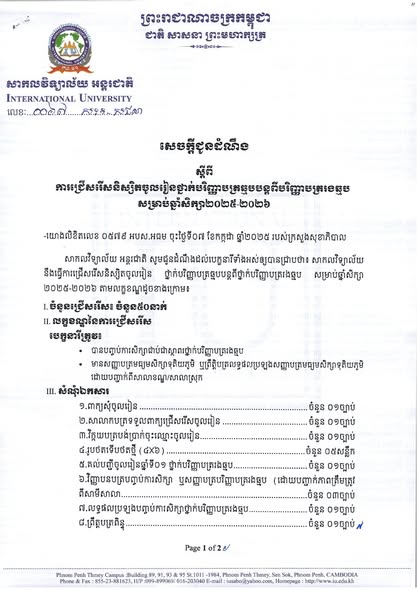 សាកលវិទ្យាល័យ អន្តរជាតិ សូមជូនដំណឹងដល់បេក្ខជន-បេក្ខនារីទាំងអស់ឲ្យបានជ្រាបថា សាកលវិទ្យាល័យ នឹងធ្វើការជ្រើសរើសនិស្សិតចូលរៀន ថ្នាក់បរិញ្ញាបត្រឆ្មបបន្តពីបរិញ្ញាបត្ររងឆ្មប សម្រាប់ឆ្នាំសិក្សា២០២៥-២០២៦